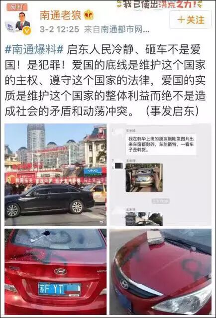 2日中国互联网上传出一组一辆挂有江苏南通牌照现代汽车被砸的照片,引起广泛关注。目前与这组照片对应的情况尚不清楚,比如照片是不是新近拍摄的,砸车是否与反“萨德”有关等。网上存在各种传闻和推测。本文从最坏的角度做一个评论,即如果这辆车被砸与抵制“萨德”入韩有关,那么我们不仅认为这一行为是不可接受的,而且呼吁当地公安机关立即立案调查,将砸车者绳之以法。