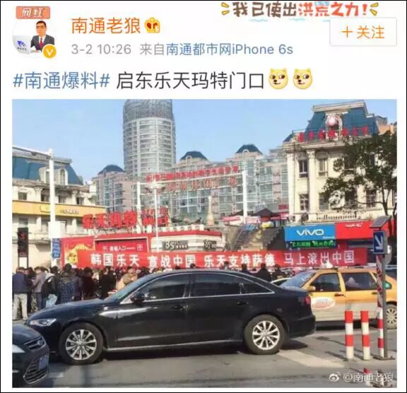 3月2日,有微博网友“爆料”,称江苏启东县一家乐天百货附近,当人们正拉横幅抵制这家超市时,商场附近的韩国车被砸了。