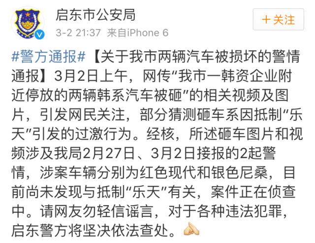 此外,启东市公安局发布通报称,网传被砸车辆分别为红色现代和银色尼桑,目前尚未发现与抵制“乐天”有关,案件正在侦查中。对于各种违法犯罪,启东警方将坚决依法查处。