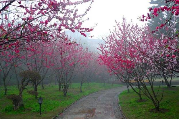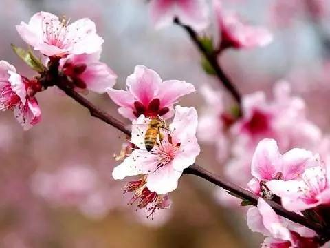 第一声春雷响过,桃就要绽蕾了。桃之夭夭,灼灼其华,桃红一出,春光便都被它占尽。桃花的意境,最耐咀嚼的是杜牧的“一岭桃花红锦黦(音‘越’)”——满山都被夭红染透,风吹如红锦要飘飞。杜甫说:“点注桃花舒小红”。那桃腮是经青葱雨脚的点注,才在星靥中含了几分醉态,变成更娇嗔的酡红。