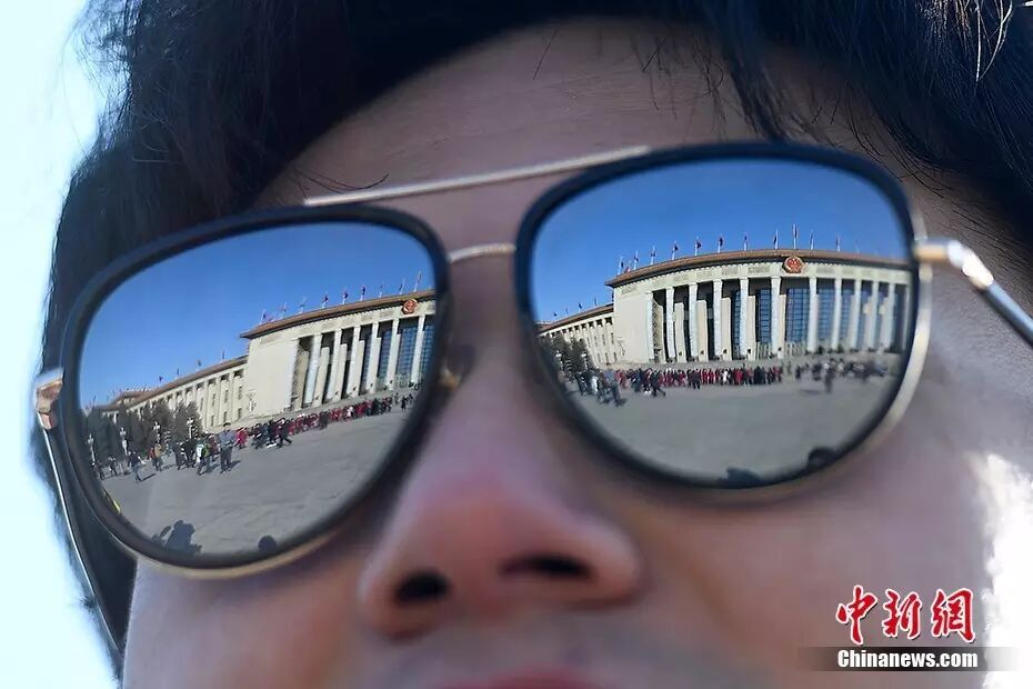 一名记者在人民大会堂外等候入场采访。 中新社记者 韦亮 摄