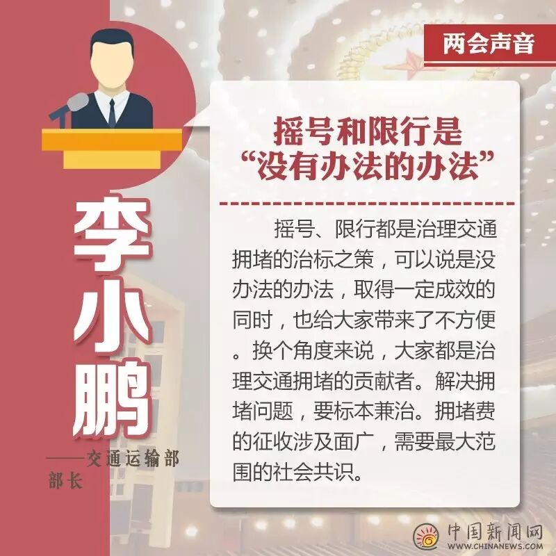 针对交通拥堵,李小鹏说,要靠综合施策解决问题,征收拥堵费要形成社会共识,依法实施。