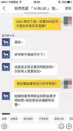 一家名为“自然而蓝”的店铺主营服装类商品,客服称,买家发出的好评率要在98%以上,才可以在店中购买。目前有很多家店铺都有类似设置,“因为有种行当叫职业差评师,所以很多家店铺都会设置,只是标准不一样,算是不成文的规矩。”