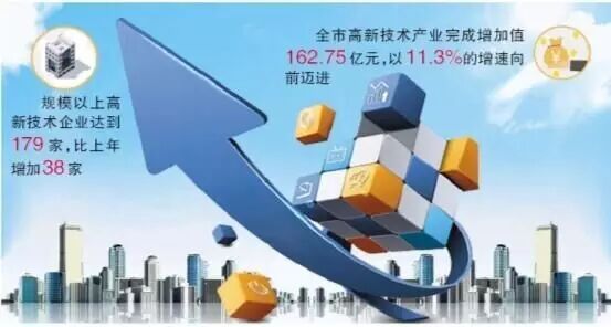 ●高新技术产业成为去年工业经济发展亮点之一。全市高新技术产业完成增加值162.75亿元,以11.3%的增速向前迈进;规模以上高新技术企业达到179家,比上年增加38家,产业规模不断扩大;实施科技成果转化项目77项,登记技术合同交易额达到19亿元、比上年增长72.7%,专利申请量达3406项,专利授权量达1912项。