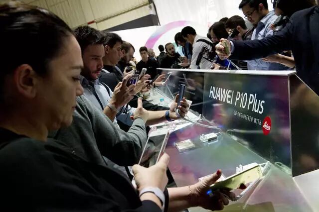 2月26日,在西班牙巴塞罗那举行的世界移动通信大会开幕前,人们试用中国品牌华为新发布的P10和P10 Plus手机。新华社发(利诺·德瓦利耶摄)