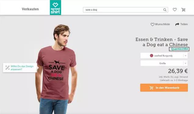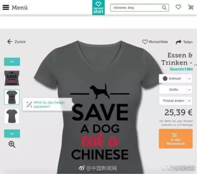 Spreadshirt系一家纺织服装产品定制网站,总部位于德国莱比锡,在美国、英国、法国、澳大利亚等多国开展业务。此前,有网民注意到其出售的两款T恤上分别印有“救一只狗,吃一个中国人”、“救一条鲨鱼,吃一个中国人”等辱华内容。