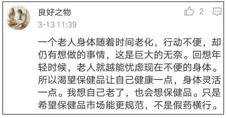 保健品如此让老年人痴迷,有网友分析了其中的原因。有人认为,老年人如此急迫地相信保健品,其实是害怕面对自己老去: