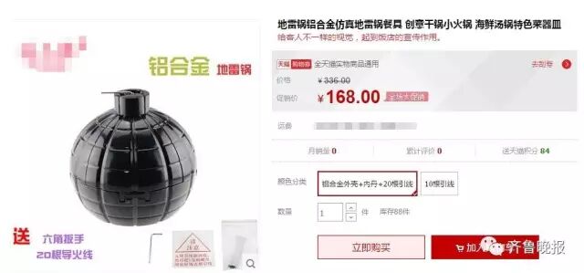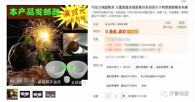 记者在网上搜索发现,“地雷”只是一个噱头而已,其实这是一个比较简单的装置。只要点燃“地雷”上方的引线,引线燃尽后,“地雷”上部就会分瓣裂开,露出底部的菜品。而在网上的网店也能查到有这样地雷模具出售。