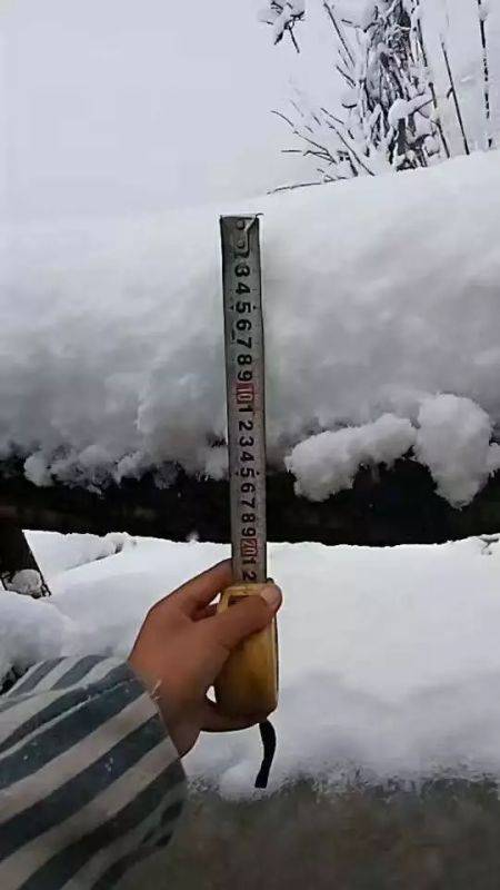 湖北保康的雪下得也是毫不示弱,网友直接拿尺子来测量厚度了。
