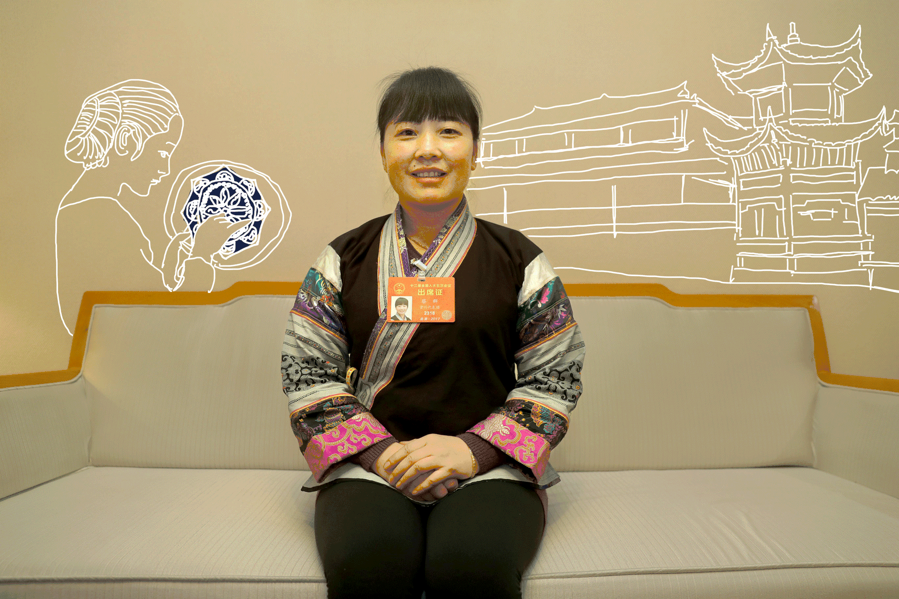 ——全国人大代表蔡群在老家贵州毕节织金县官寨乡大寨村苗寨开了一家苗族蜡染刺绣公司,带动寨子里300多名外出打工的妇女一起回乡创业。