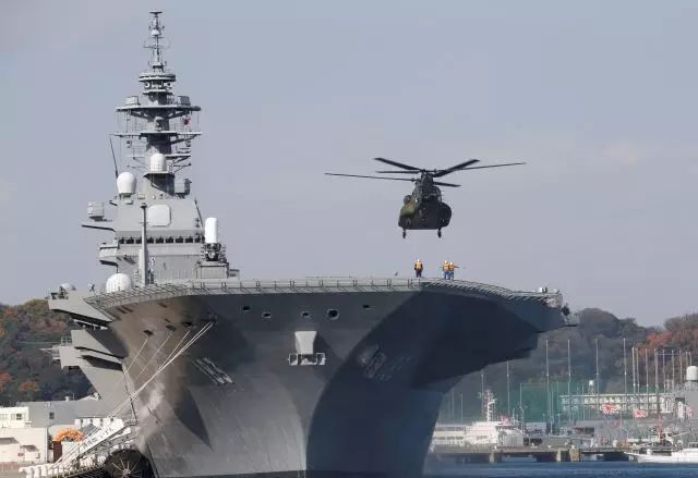 于2015年服役的“出云”号,是第二次世界大战结束后日本建造的最大战舰,长248米,宽38米,标准排水量1.95万吨,可同时起降5架直升机,最多可搭载14架直升机,并能为其他舰艇提供燃料补给。