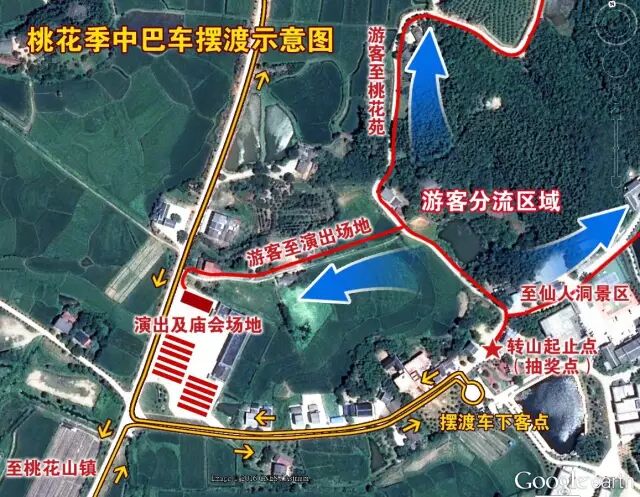 本次桃花季,景区将安排中巴摆渡车循环接送游客,自驾游客将车停放在指定位置后,免费乘坐摆渡车进入景区。