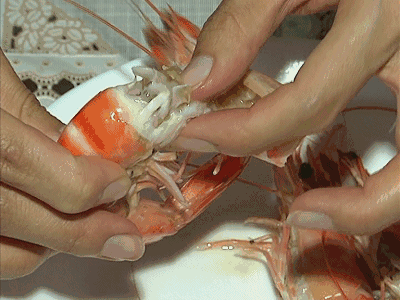 刚才看完了两碟怀疑有问题的虾之后,再拿出这个渔民真正在海上打捞出来的海虾九节虾,进行对比,看看这个虾的虾头和虾身中,有没有存在疑似胶状物质的情况?