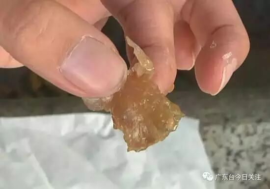 “物质大块一点的话,会比黄豆大一点,小块一点的话就是一层层,像纸状一样,有些就像我们平时煮东西,凝固了的透明状一样,异味倒是没有,就是很晶莹剔透,也不知道这些有没有毒,吃了有什么后果也不知道。”