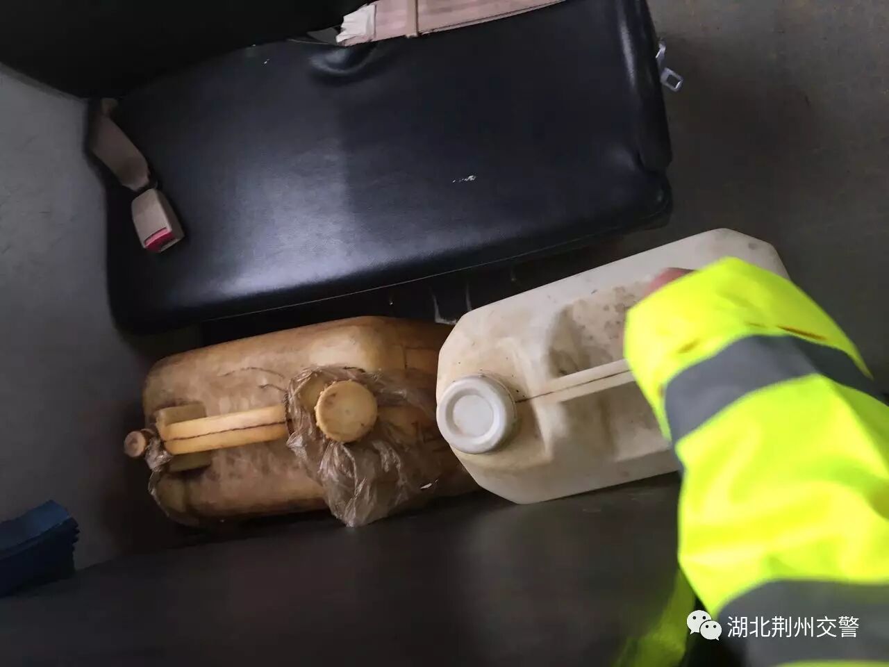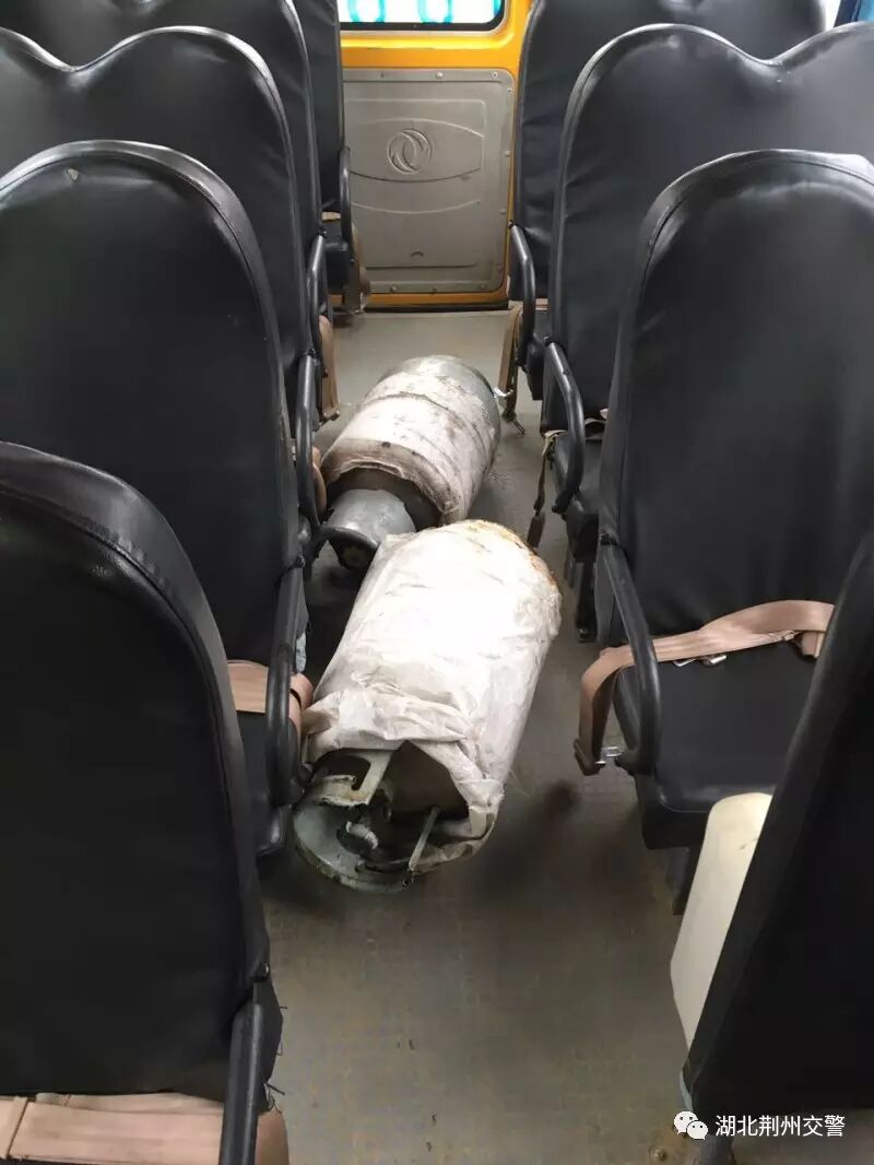 23日上午10时30分许,松滋市纸厂河派出所交警中队查处一辆湖南省常德市澧县的校车,车内装有两个液化气钢瓶和两个装柴油的油壶。