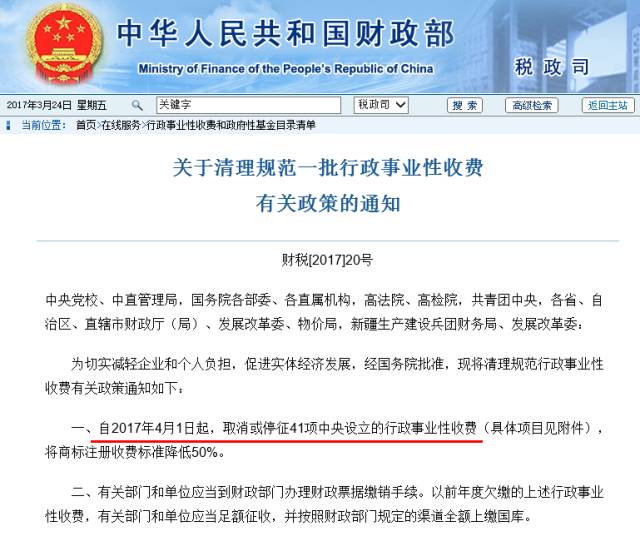 自2017年4月1日起,取消或停征41项中央设立的行政事业性收费,将商标注册收费标准降低50%。
