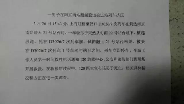 3月26日15:43分,上海虹桥至汉口D3026/7次列车在到达南京南站进入21号站台时,一年轻男子突然从对面22号站台跳下,横越股道,抢在D3026/7次列车前,试图翻上21号站台未果,被夹在D3026/7次列车1号车厢与站台之间,列车立即停车。车站工作人员第一时间拨打电话通知120急救中心、公安和消防部门到现场开展救援,在救援的过程中,120医生宣布该男子死亡。相关具体情况警方正在进一步调查。
