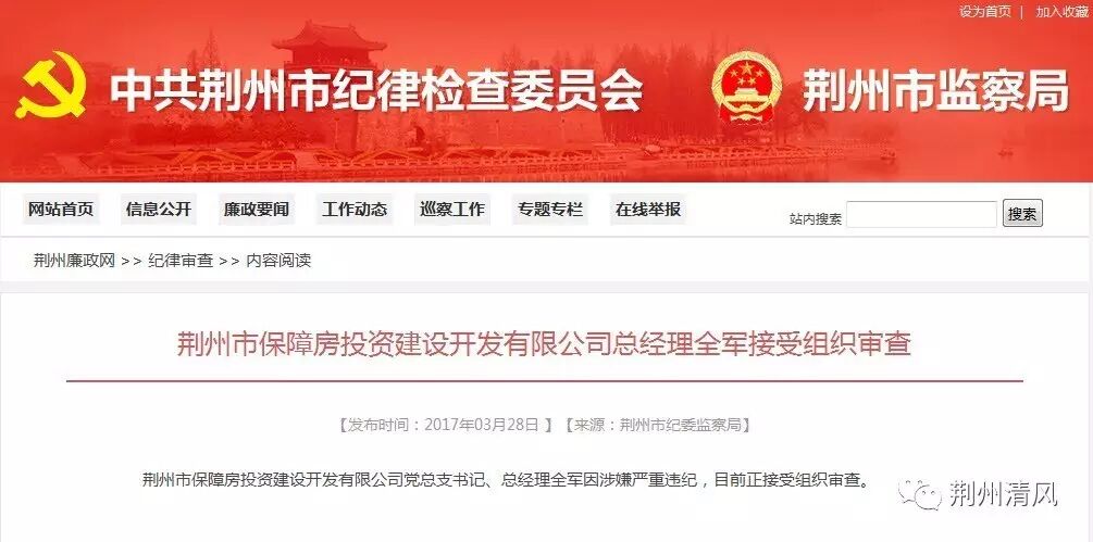 荆州市保障房投资建设开发有限公司党总支书记、总经理全军因涉嫌严重违纪,目前正接受组织审查。