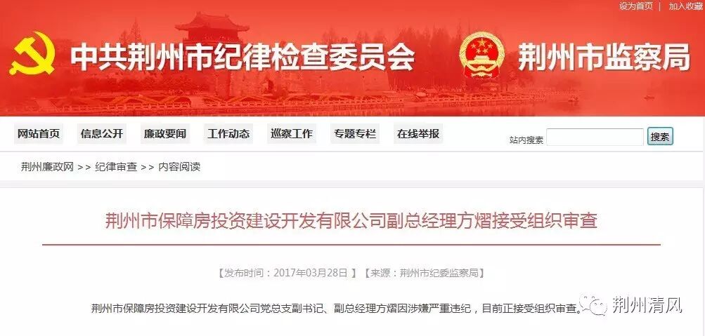 荆州市保障房投资建设开发有限公司党总支副书记、副总经理方熠因涉嫌严重违纪,目前正接受组织审查。