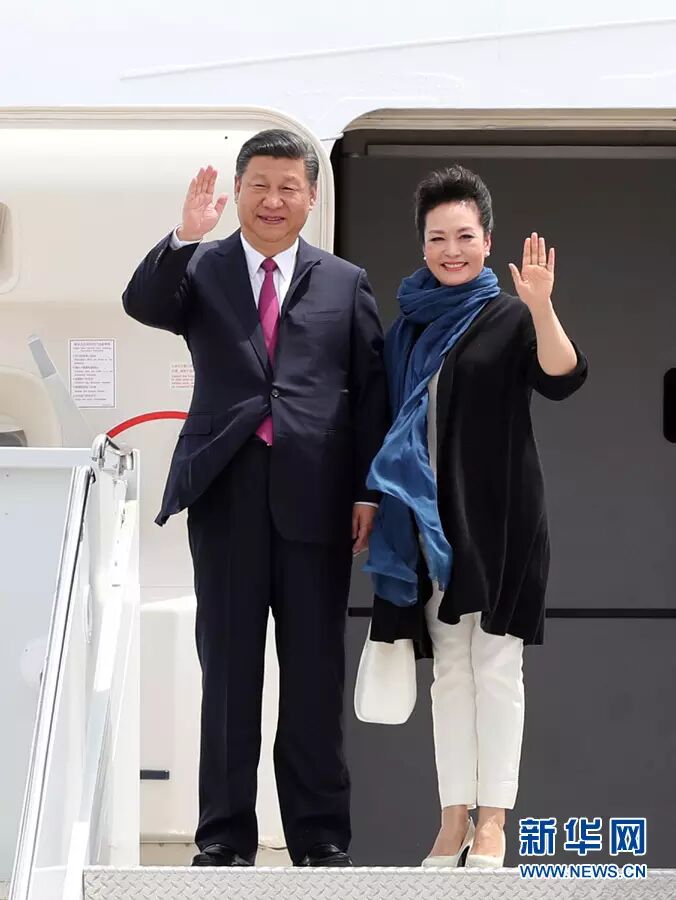 习近平主席和夫人彭丽媛走下车来,特朗普总统和夫人梅拉尼娅上前迎接,宾主握手寒暄。