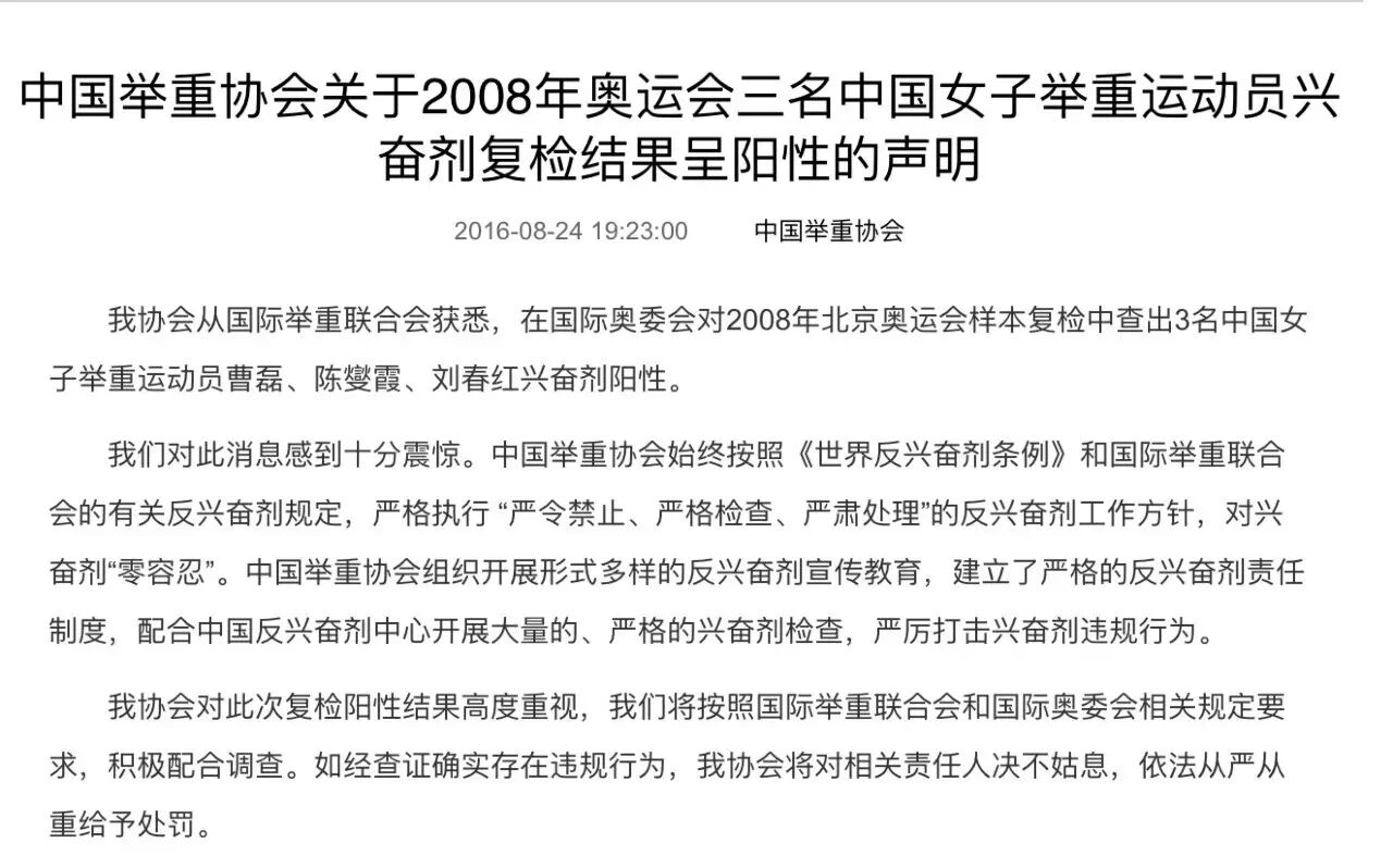 中国举重协会24日晚间,就北京奥运会三位女子举重运动员曹磊、陈燮霞和刘春红兴奋剂复检结果呈阳性发表声明。