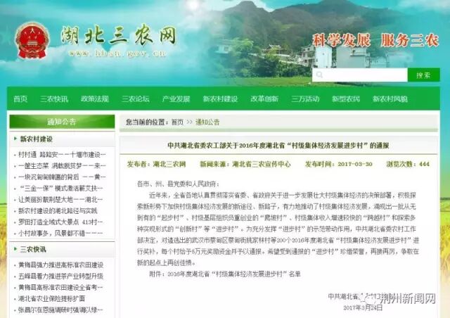 最近,中共湖北省委农村工作部发布了《关于2016年度全省“村级集体经济发展进步村”拟表彰名单》,对200个获得2016年度湖北省“村级集体经济发展进步村”进行奖补,每个村给予5万元奖励资金,并予以通报。