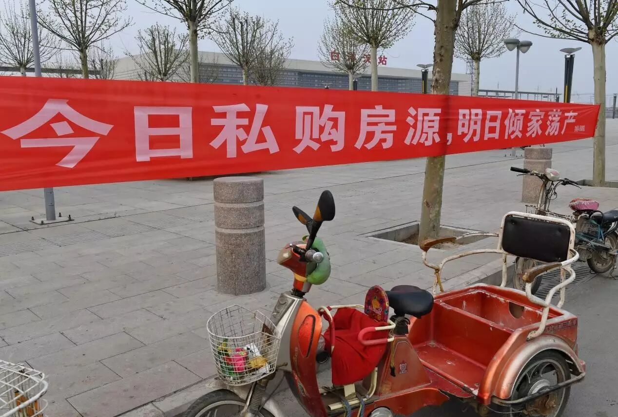 4月7日,容城县白洋淀站广场上悬挂的遏制炒房的标语。