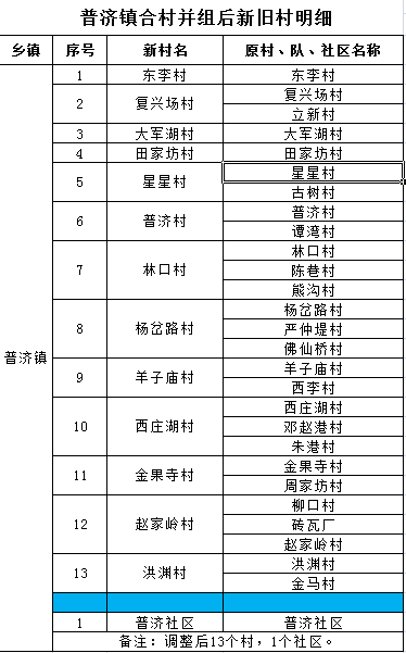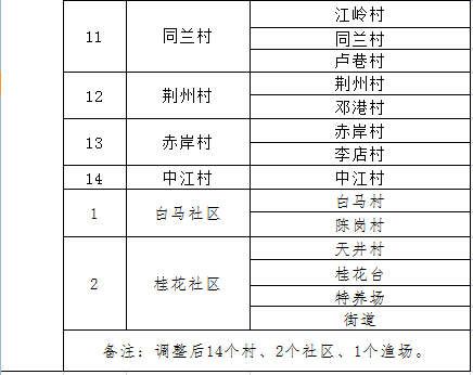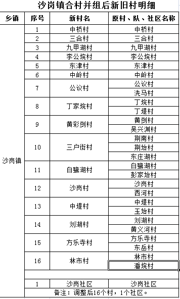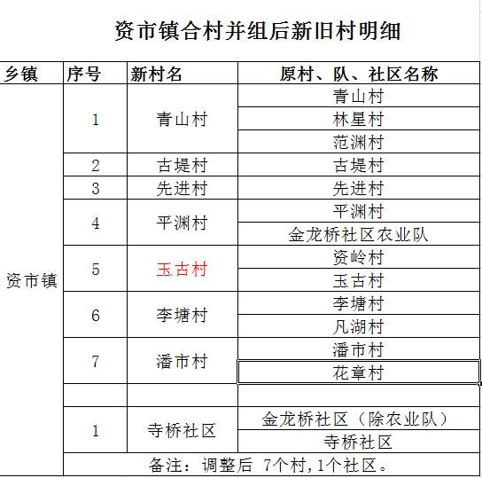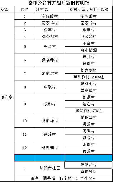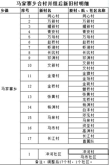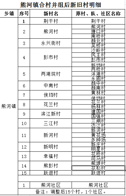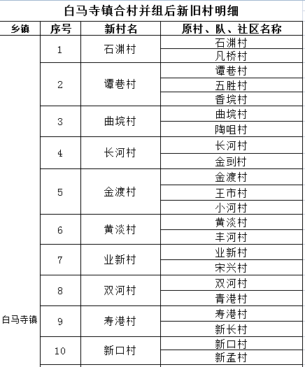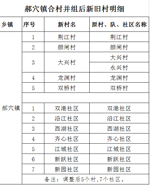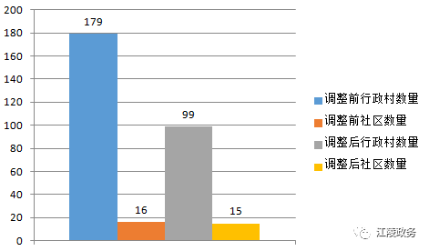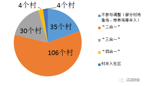 原179个行政村中,35个村不参与调整(部分村将渔场、特养场等并入),其余144个村调整合并为64个村,其中,106个村“二合一”,30个村“三合一”,4个村“四合一”,4个村并入社区(白马寺镇2个、秦市乡1个、马家寨乡1个),另资市镇寺桥社区与金龙桥社区进行了合并。