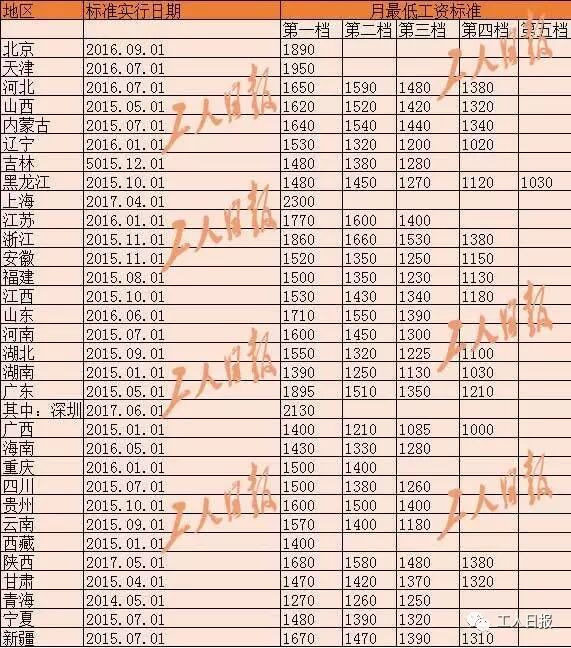 人社部网站公布的全国各地区月最低工资标准情况如下图(截至2016年12月):