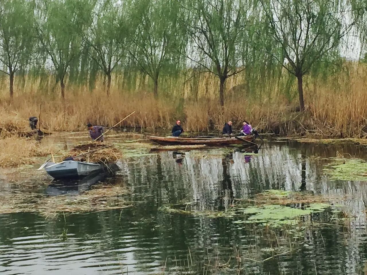 4月9日,安新县白洋淀,村民在打捞水面的芦苇