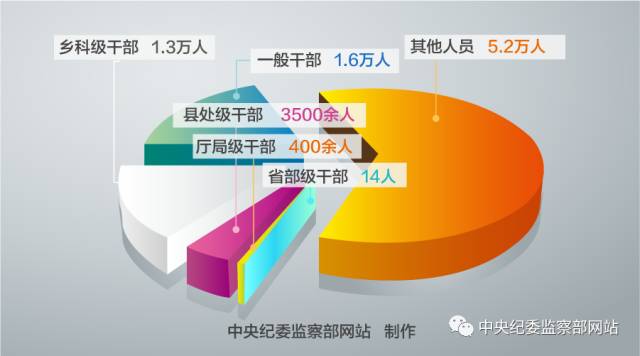 2017年第一季度,全国纪检监察机关共接受信访举报62.3万件次,处置问题线索19.4万件,谈话函询3.8万件次,立案10.2万件,处分8.5万人(其中党纪处分7.1万人)。处分省部级干部14人,厅局级干部400余人,县处级干部3500余人,乡科级干部1.3万人,一般干部1.6万人,农村、企业等其他人员5.2万人。