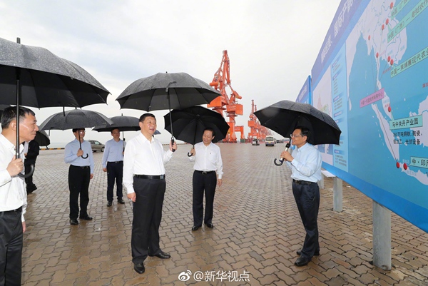 习近平总书记19日下午冒雨考察坐落于广西北部湾的北海市铁山港公用码头。天高水阔,吊车高耸入云。他听取码头规划和建设情况,了解广西北部湾经济区发展建设和面向东盟开放合作情况。习近平表示,铁山港有区位优势,发展前景广阔,将来是北部湾经济区一个重要依托。要建设好北部湾港口,打造好向海经济。我们常说要想富先修路,在沿海地区要想富也要先建港。
