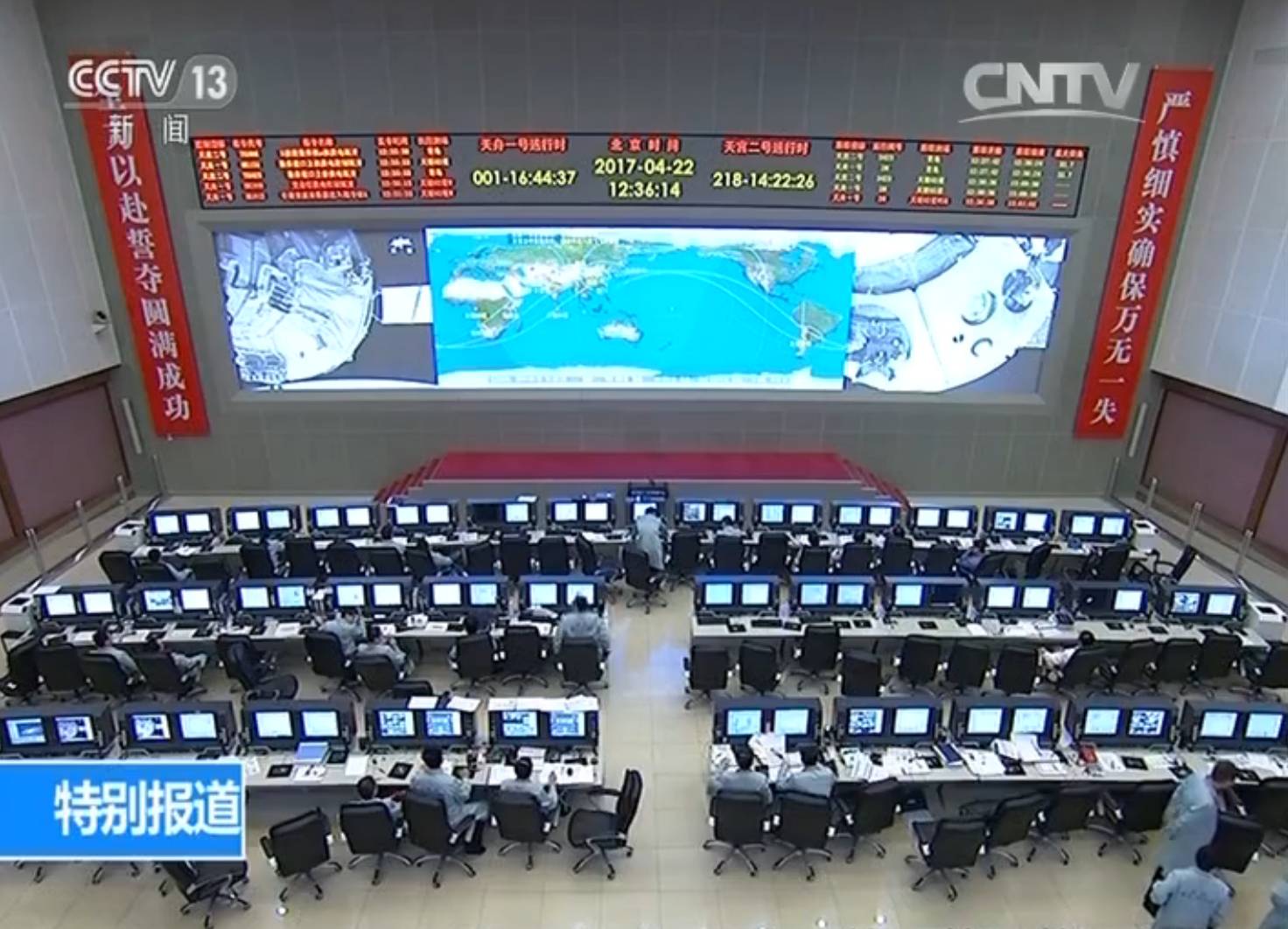 经北京航天飞行控制中心就对接准备状态进行最终确认,天舟一号开始向天宫二号缓缓靠拢。12时16分,天舟一号与天宫二号对接环接触,在按程序顺利完成一系列技术动作后,对接机构锁紧,两个飞行器建立刚性连接,形成组合体。