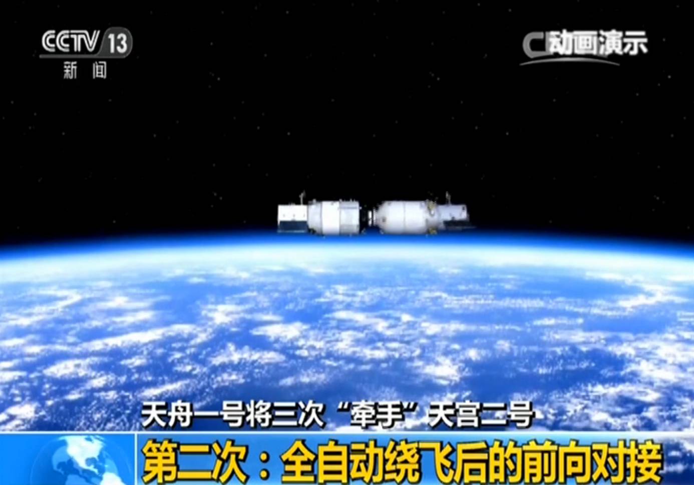 在科技人员精确控制下,天舟一号货运飞船经多次变轨,于22日10时02分转入自助控制状态,以自主导引控制方式向天宫二号空间实验室逐步靠近。