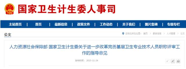 先是2015年11月人社部发布了《关于进一步改革完善基层卫生专业技术人员职称评审工作的指导意见》,开始为基层医护人员的职称评级松绑,表示论文、科研要求不做硬性规定,只作为评审的参考条件。