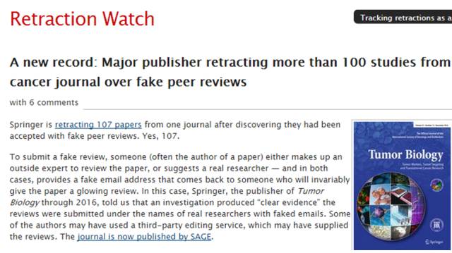 当时曝光我们的是英国的医疗科学学术文献出版商BioMedCentral,说有41篇来自中国的论文造假,而造假的手段也与今天《肿瘤生物学》期刊上被曝出的107篇论文的问题一模一样,都是同行评审造假!