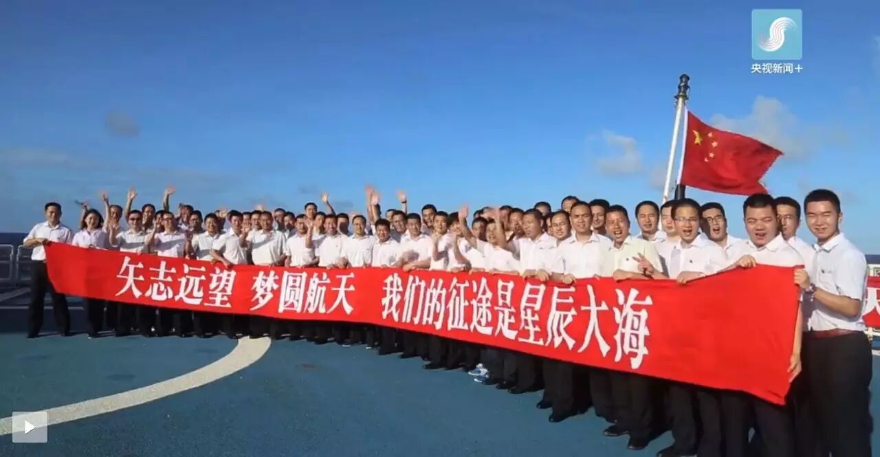 一天的忙碌后,船员们在上甲板合影留念,“矢志远望,共圆‘航天梦、中国梦’”的口号在大洋深处久久回响、经久不绝。