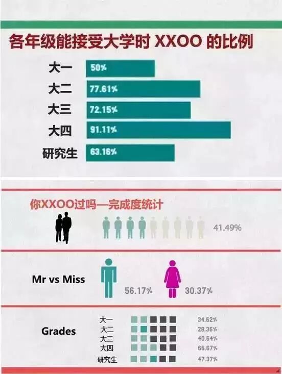 随着时代的发展,人们对于性话题及性行为的接受程度越来越高。2015年,某平台针对北京、上海、广州、深圳、武汉、西安等34个城市的高校本科生,分男女、年级进行摸底调查研究显示: