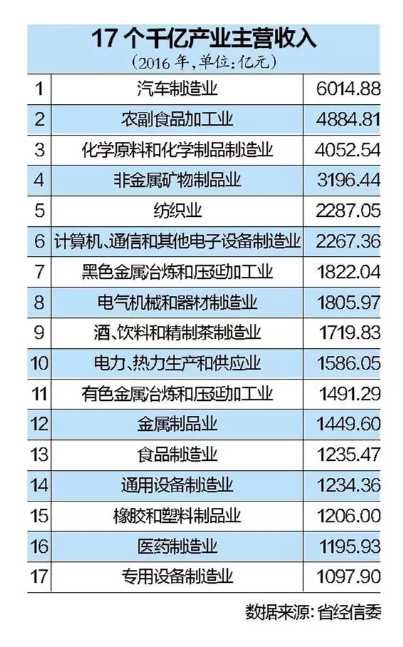 面对经济下行压力,千亿产业搏击市场风云,逆势奋进。省经信委数据显示,2016年,支柱产业实力增强,食品、石化、汽车、电子信息、机械、冶金、纺织、建材等支柱产业规模不断壮大,占全省工业主营收入比重达90%。其中,超过4000亿元的产业有5个,食品(含烟草)接近8500亿元,石化、汽车产业规模均超6000亿元。