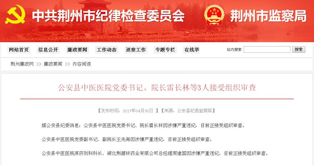 据公安县纪委消息:公安县中医医院党委书记、院长雷长林因涉嫌严重违纪,目前正接受组织审查。