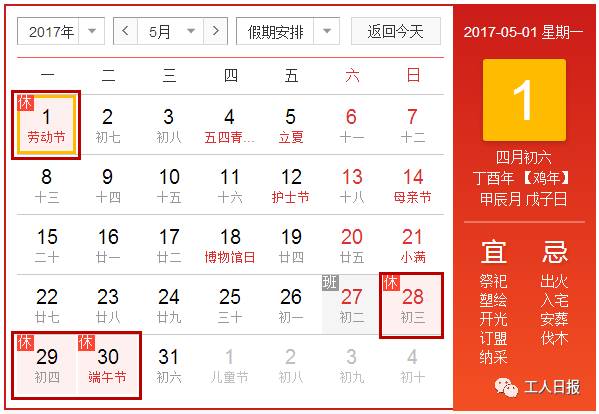 2017年端午节是5月30日,农历五月初五,星期二。根据《国务院办公厅关于2017年部分节假日安排的通知》,2017年端午节放假安排如下: