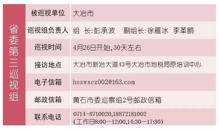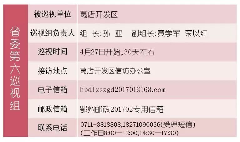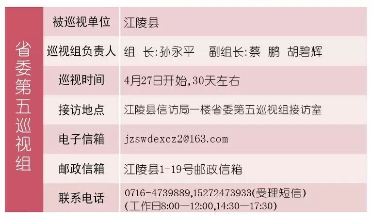此前,4月24日-27日,省委第四、第七、第八、第十、第十一巡视组分别进驻省总工会、省质监局、宜昌市、襄阳市、孝感市、随州市及当阳市、夷陵区、老河口市、鱼梁洲开发区、大悟县、孝昌县、广水市、随县开展巡视“回头看”。