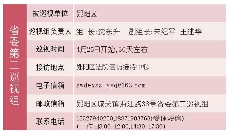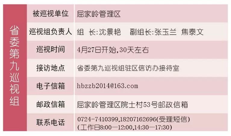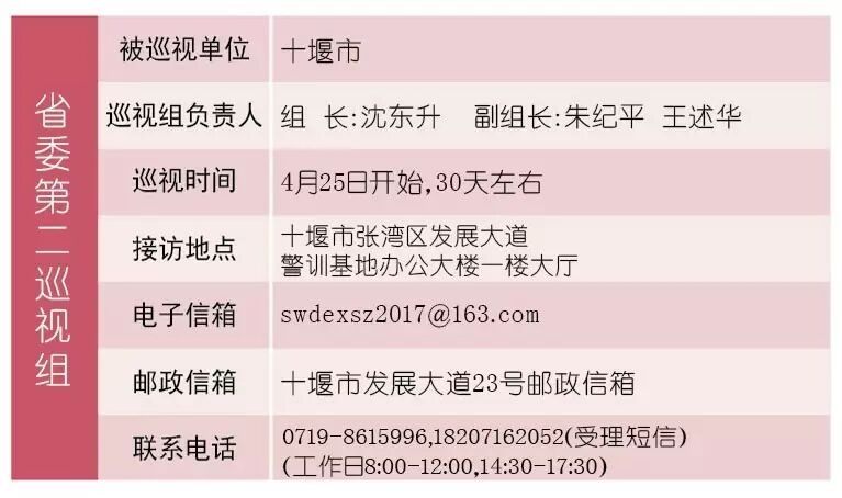 根据省委统一部署,4月25日-28日,省委第一、第二、第三、第五、第六、第九巡视组分别进驻黄冈市、十堰市、黄石市、荆州市、鄂州市、荆门市及麻城市、蕲春县、郧阳区、竹山县、大冶市、西塞山区、洪湖市、江陵县、葛店开发区、鄂城区、京山县、屈家岭管理区开展巡视“回头看”,并召开了巡视工作动员部署会。至此,省委11个巡视组今年上半年对2家省直单位和10个市、20个县(市、区)的巡视“回头看”已全部进驻。