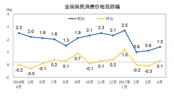 今天(5月10日)上午,国家统计局公布数据显示,4月我国居民消费价格指数CPI同比上涨1.2%,涨幅比上月扩大0.3个百分点。其中,食品价格下降3.5%,非食品价格上涨2.4%。这是CPI涨幅连续两个月低于1%后重回1%以上。