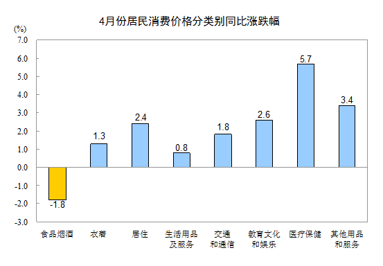 从同比看,4月份CPI上涨1.2%,涨幅比上月扩大0.3个百分点,但比一季度平均涨幅低0.2个百分点。非食品价格同比上涨2.4%,影响CPI上涨约1.90个百分点。食品烟酒价格同比下降1.8%,影响CPI下降约0.56个百分点。其中: