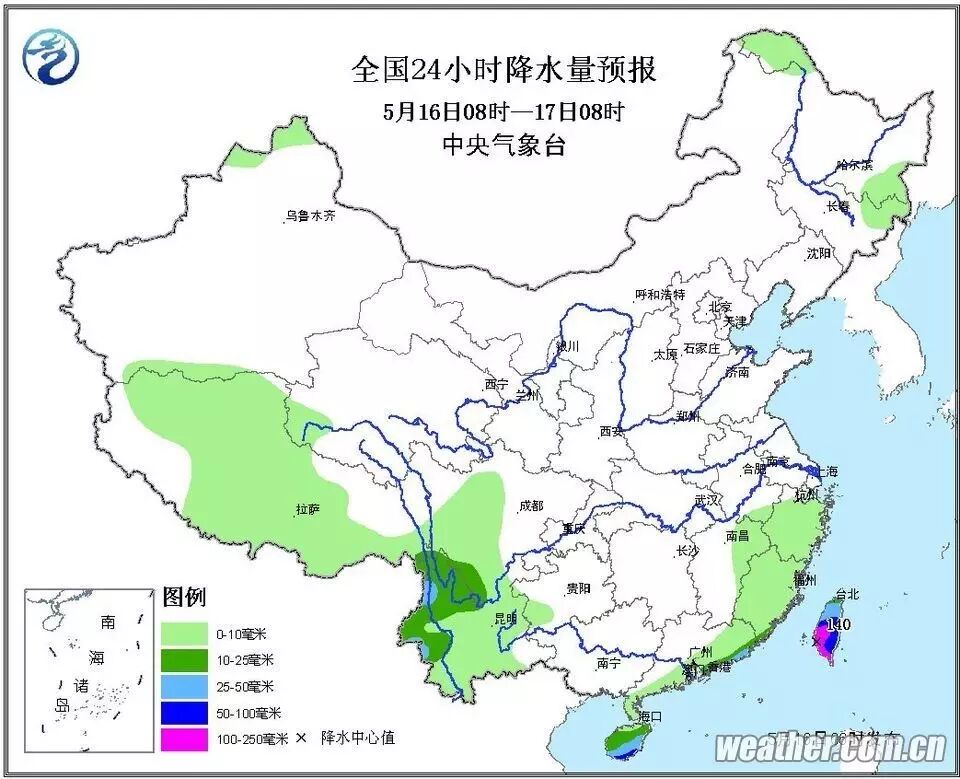 中央气象台预计:今早8点至明早8点,广东东南部沿海、海南、台湾有中到大雨,其中,海南岛南部、台湾中南部等地有暴雨,局地有大暴雨;上述地区局部并伴有短时强降水、雷暴大风等强对流天气,云南西部等地有小到中雨或雷阵雨,局地有强对流天气。