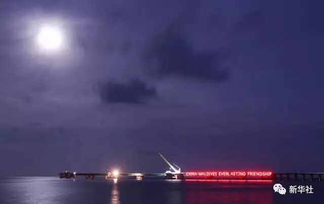 4月21日,在马尔代夫,建设中的中马友谊大桥上亮起“中马友谊长存”的霓虹灯。新华社发(中马友谊大桥项目部供图)