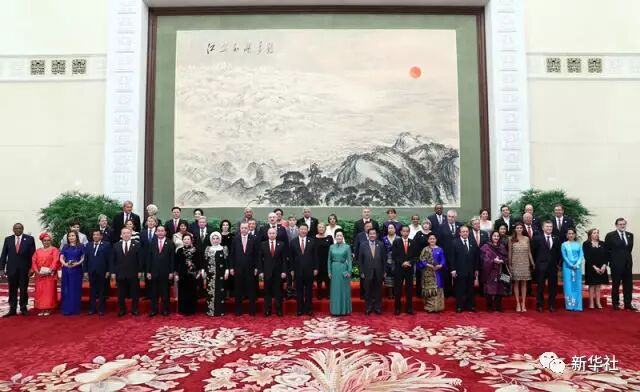 人民大会堂《江山如此多娇》巨幅画作前,习近平主席同前来出席“一带一路”国际合作高峰论坛的各国贵宾合影留念。