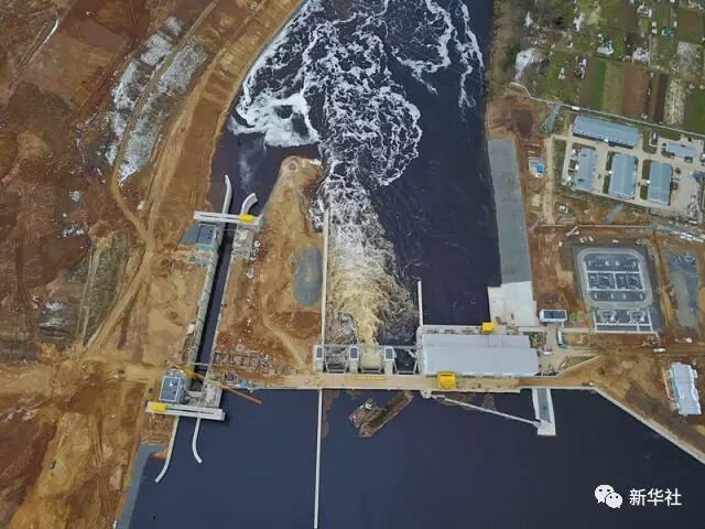 4月19日在白俄罗斯维捷布斯克拍摄的电站枢纽区全景。由中国电力工程有限公司承建的维捷布斯克水电站2013年开始导流施工,计划于今年7月完工交付当地能源局。