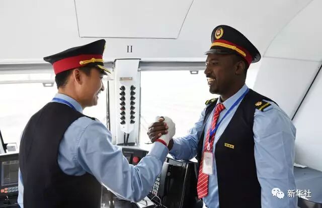 2016年10月5日,在埃塞俄比亚首都亚的斯亚贝巴的拉布车站,中方司机刘继(左)和埃塞方司机盖图在通车典礼前握手预祝通车成功。